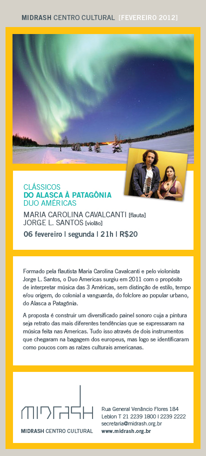 Dia 16.11.2011 haverá a estreia do Duo America, meu novo trabalho de câmara, com a flautista Maria Carolina Cavalcanti. A proposta do Duo é apresentar um repertório que de música de todas as Américas, do extremo norte ao extremo sul. A música nas Americas é tão diversificada e intensa, colorida e ousada, romântica e vanguadista e queremos mostrar um pequeno painel deste cenário.